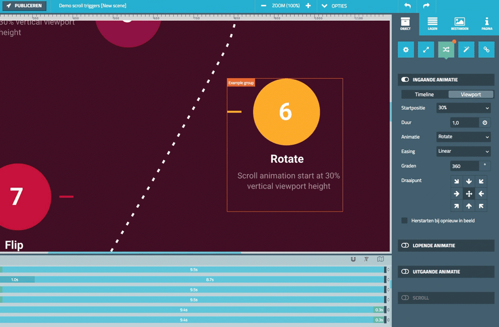 Our Pro editor was originally designed for fullscreen pages, where timed animations were created with ease. It was just a matter of adding a timer or delay to a visible element within the canvas. But due to the increasing popularity of longreads we experienced several limitations in creating animations. For example: if you wanted to add a timed animation further down a longread publication it was possible that it already triggered before even you scrolled to that particular point. And that had to change.